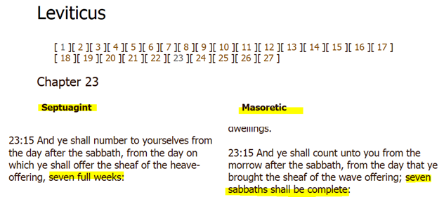 Veamos como la versión de la Septuaginta, traduce el pasaje de Levíticos 23.15 como semanas y pone sobre la mesa el hecho que el conteo comienza el día después del primer día de panes sin levadura y no el shabbat semanal.